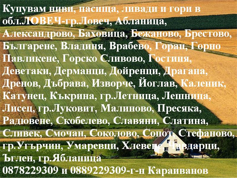 Купувам НИВИ, ПАСИЩА, ЛИВАДИ и ГОРИ в област ЛОВЕЧ – гр.Ловеч, Абланица, Александрово, Баховица, Бежаново, Брестово, Българене, ...